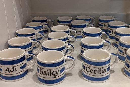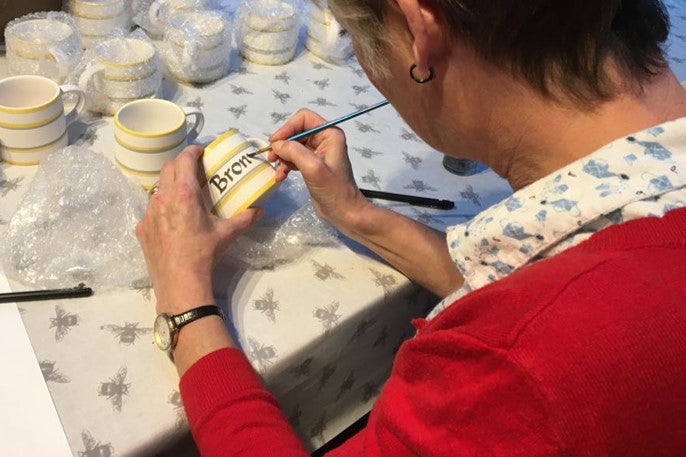 We start by marking out the lines on each mug. They are then handpainted to order.